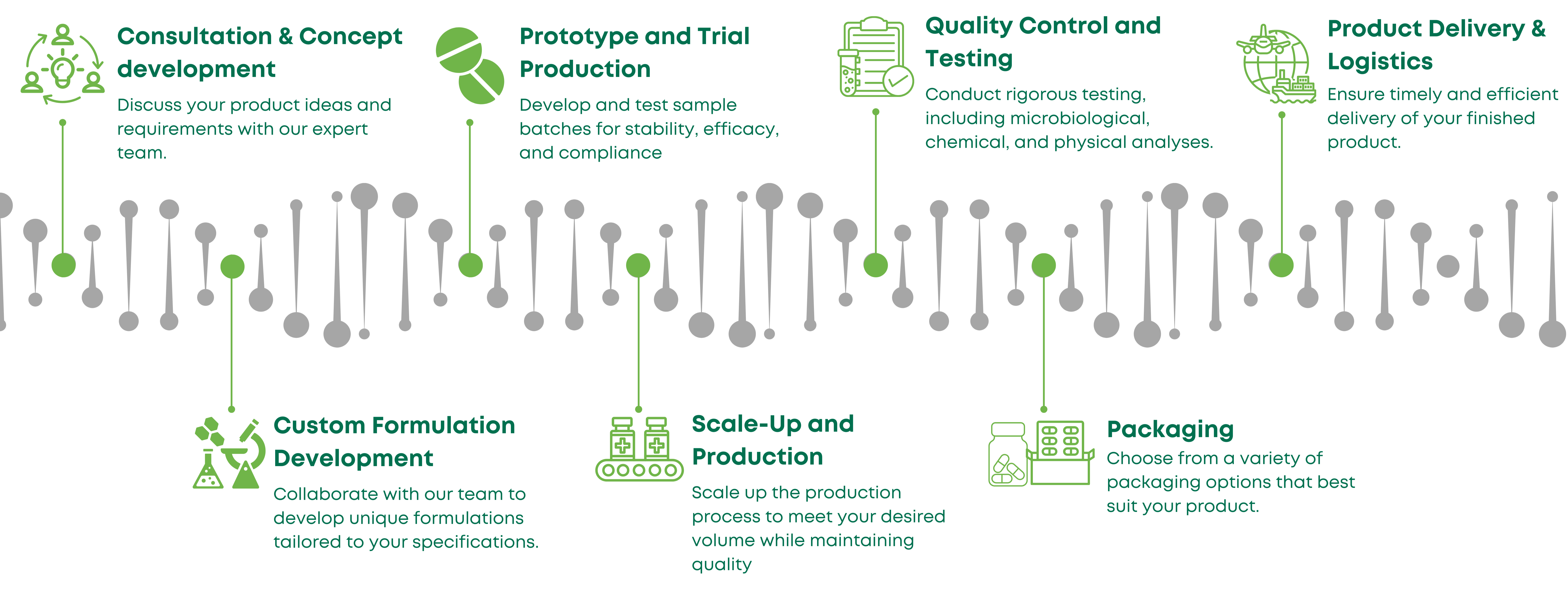 Our experienced team is here to help. From creating a unique formula to designing the right packaging, we tailor our services to match your specific needs. Our R&D team can formulate & develop products as required by your market.